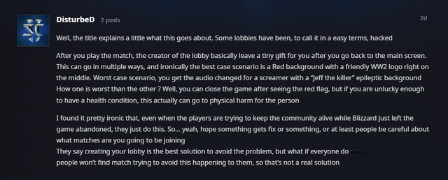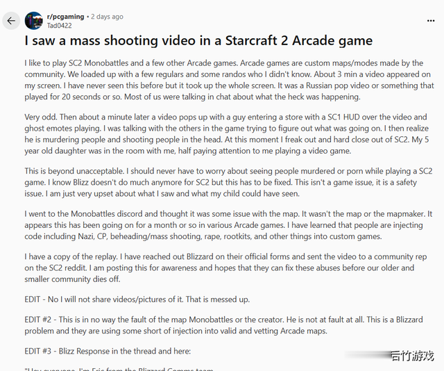 此情况已持续近一年甚至更久,只是最近被关注。4月20日,一位星际2玩家在Reddit论坛分享了自己的尴尬经历。他说在玩街机模式的某张地图时,莫名其妙地被插入一段视频。当时他刚玩3分钟,整个屏幕突然出现一段背景为俄罗斯音乐的视频,播放了大约20秒。他跟同伴还在惊诧中,第二段视频又出现。视频中,一名男子冲进一家商店,朝人们的头部开枪。